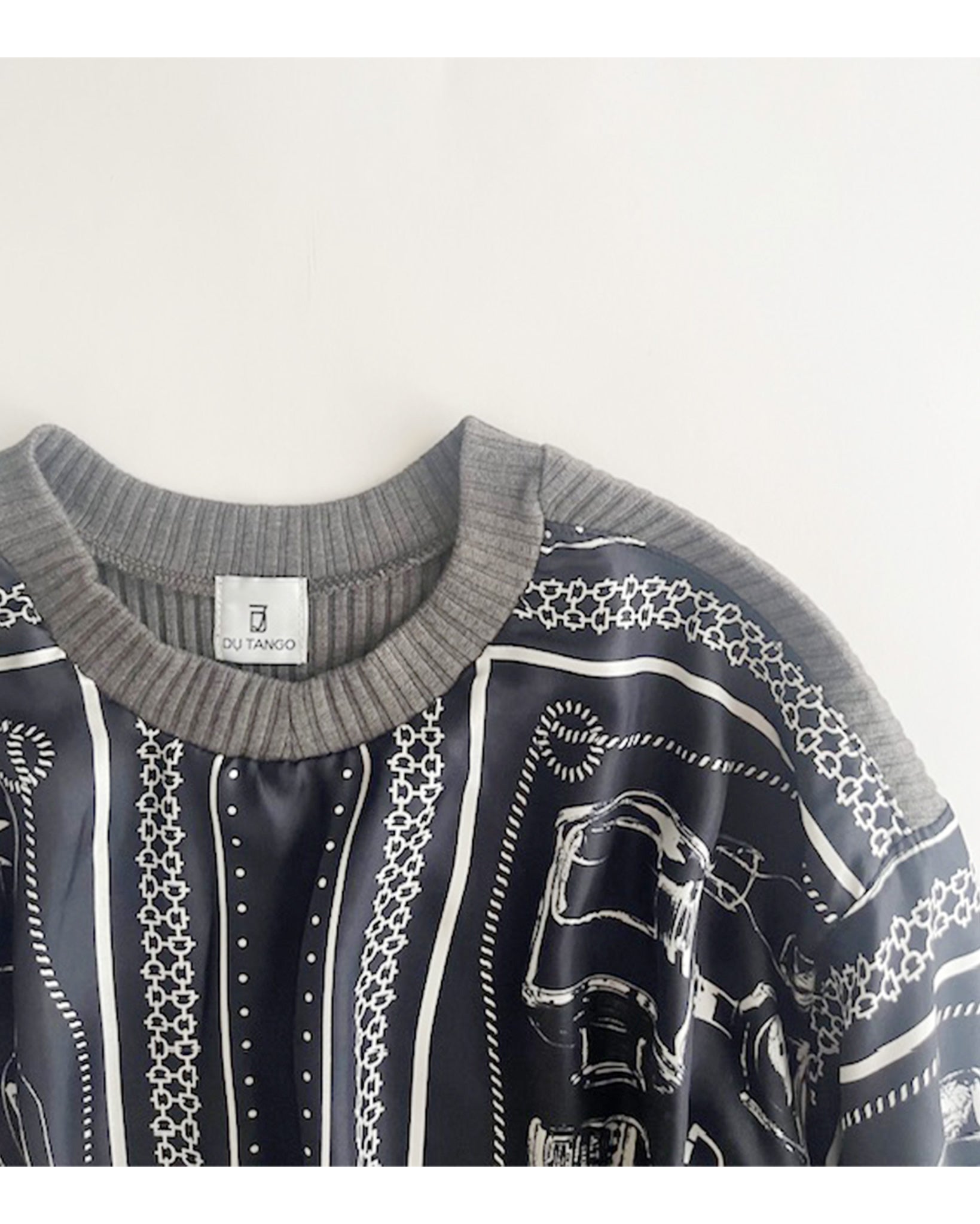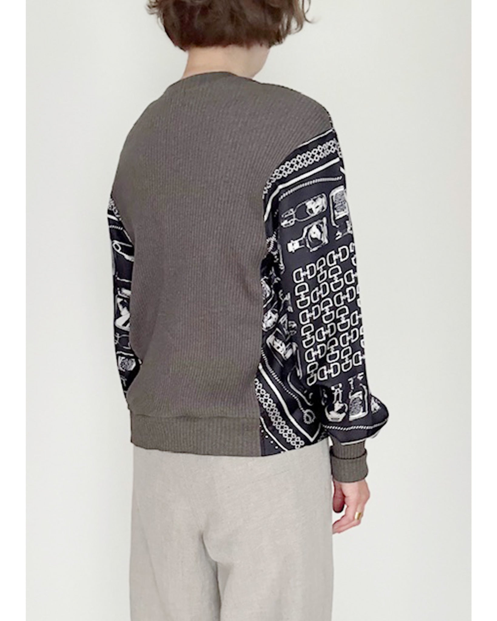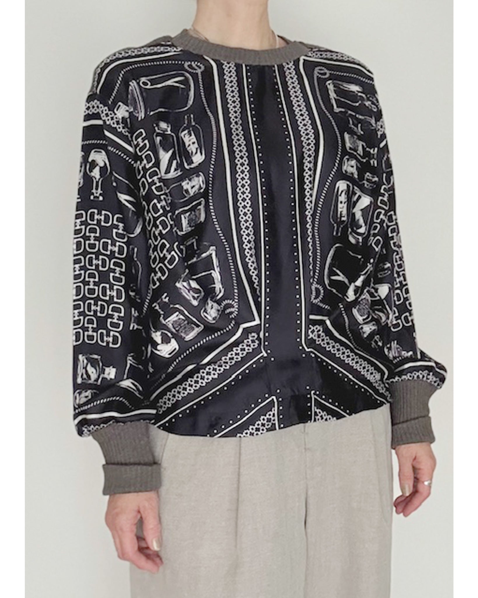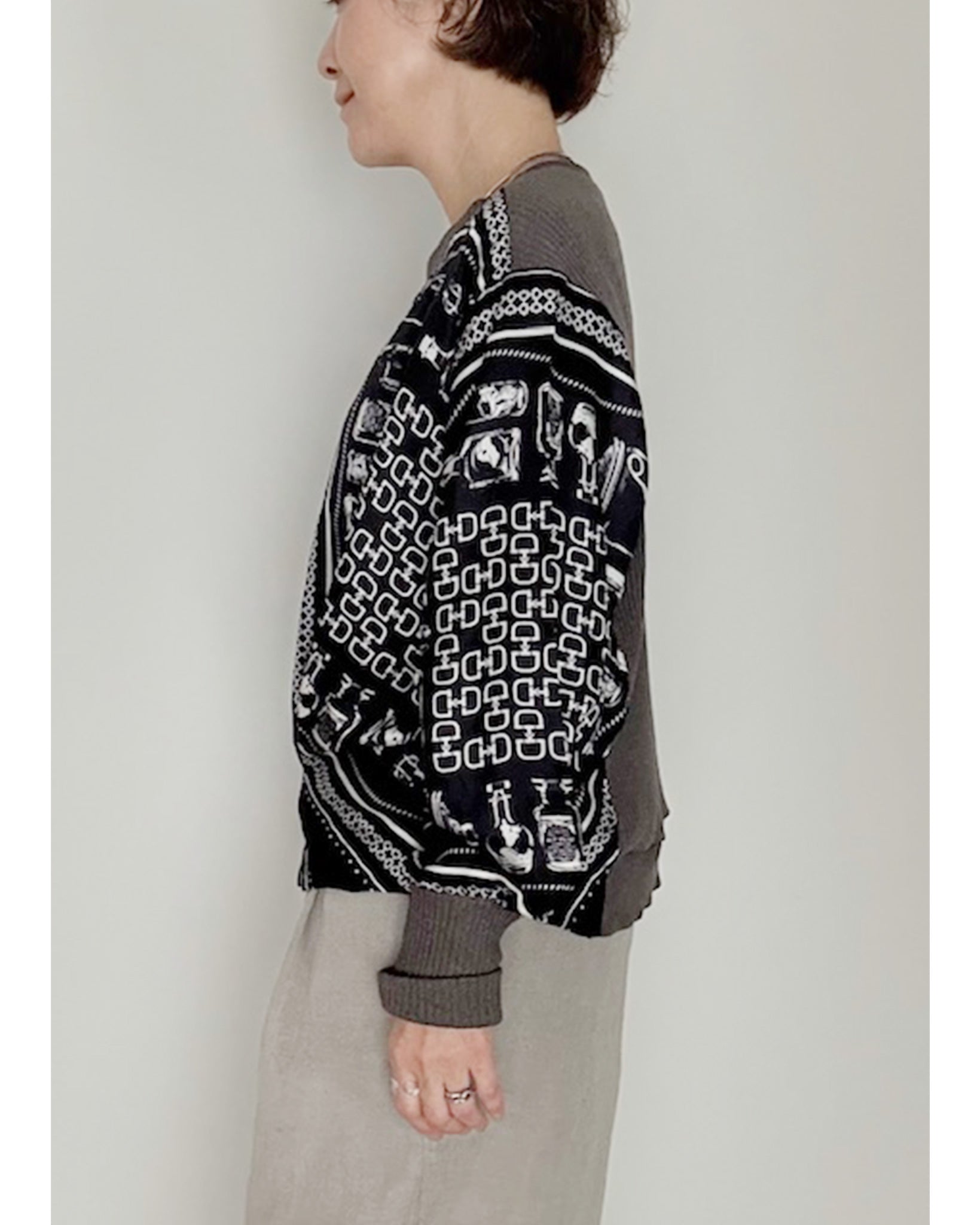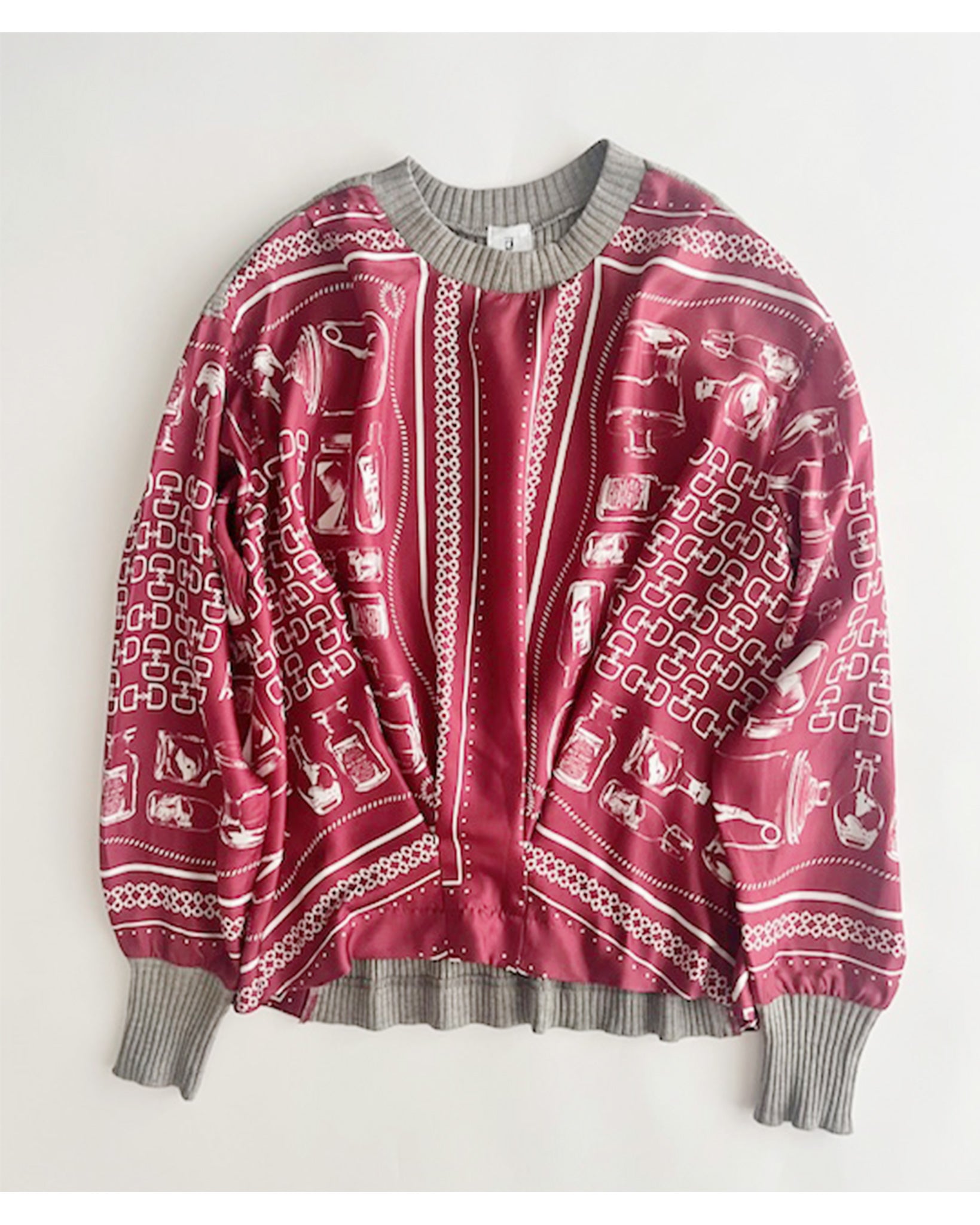 シルク100%のオリジナルプリントで展開するスカーフ生地を利用したプルオーバー。